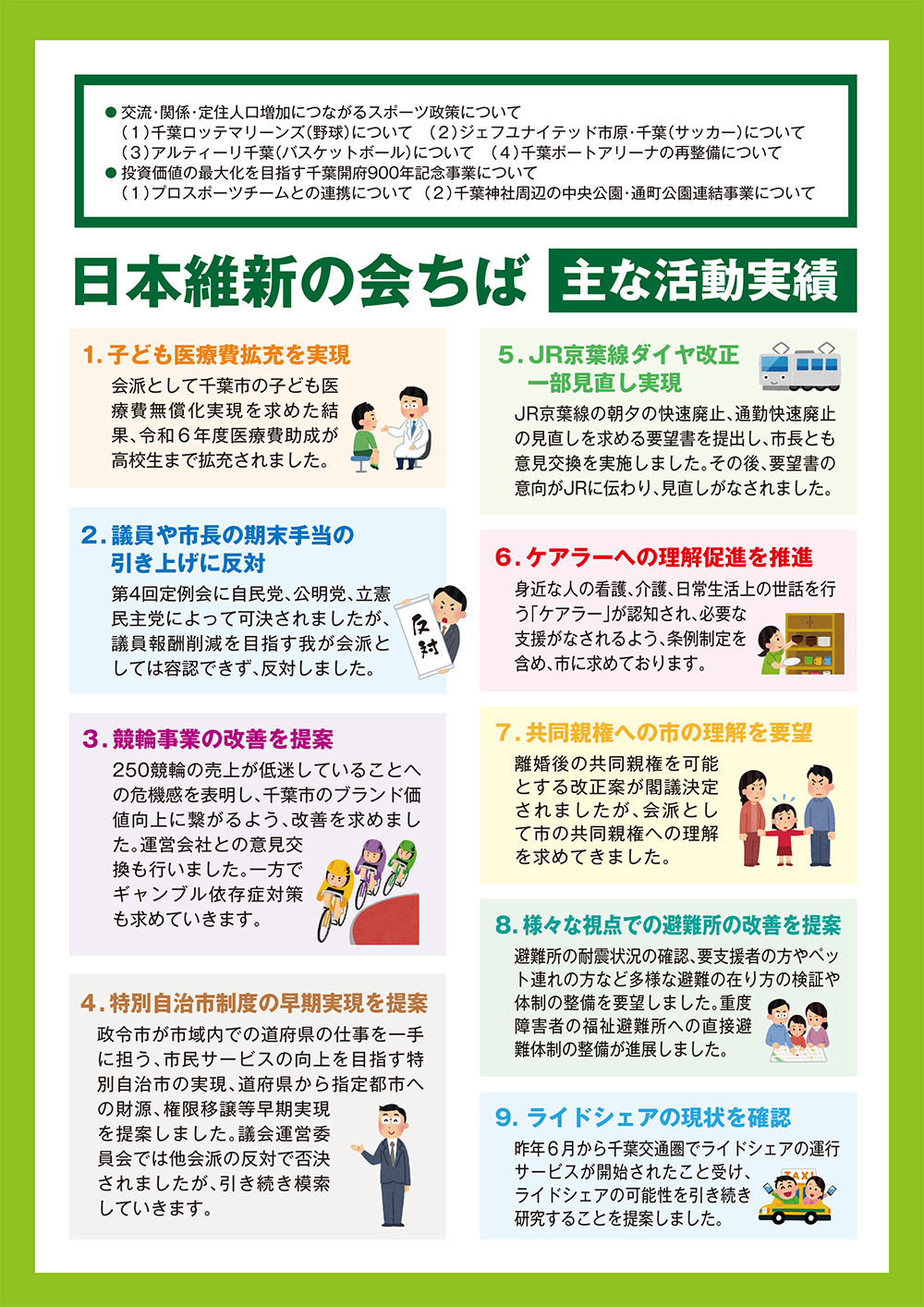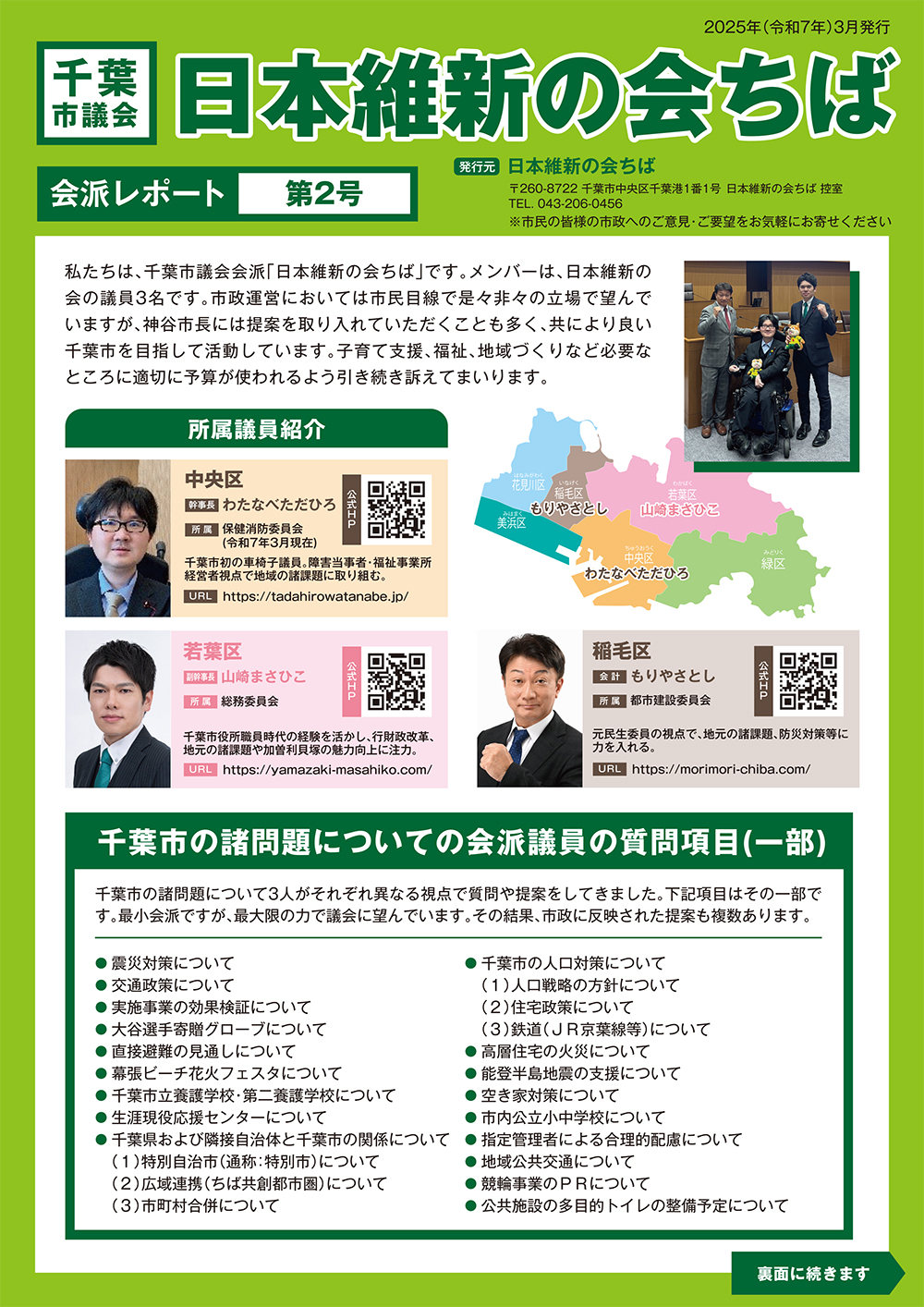 活動予定 活動履歴 地域課題の解決 市政報告 役立情報 千葉市議会レポート 2025年第2号(令和7年3月発行)をアップしました。是非ご一読いただき、ご意見・ご要望・ご感想をいただければと存じます。 PDFはこちら 市政報告 リーフ 【動画】令和7年第1回定例会(予算審査特別委員会)│令和7年2月25日 【動画】令和7年第2回定例会(本会議 市政に関する一般質問)│令和7年6月20日 関連記事 【動画】令和7年第4回定例会(本会議 一般質問)│令和7年12月11日 2025年12月19日 【リーフ】千葉市議会レポート Vol.7(令和7年12月発行) 2025年11月4日 【動画】令和7年第3回定例会(本会議 市政に関する一般質問)│令和7年9月30日 2025年10月11日 【リーフ】千葉市議会レポート Vol.6(令和7年8月発行) 2025年7月24日 【動画】令和7年第2回定例会(本会議 市政に関する一般質問)│令和7年6月20日 2025年7月23日 【動画】令和7年第1回定例会(予算審査特別委員会)│令和7年2月25日 2025年3月3日 神谷市長と政策協定締結 2025年3月3日 【リーフ】千葉市議会レポート 2025年新春号(令和7年1月発行) 2025年1月6日