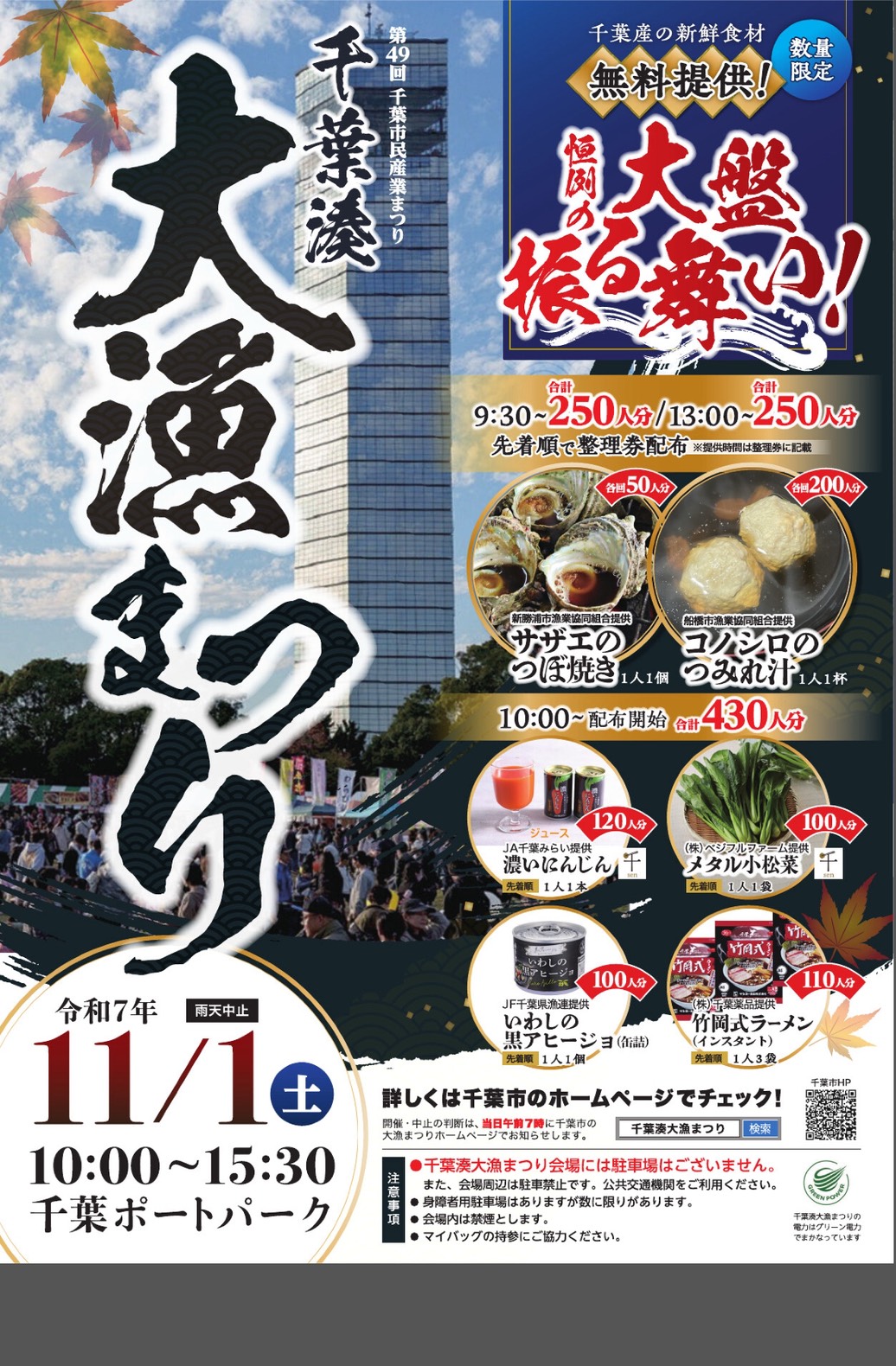 活動予定 活動履歴 地域課題の解決 市政報告 役立情報 目次第49回千葉湊大漁まつり 第49回千葉湊大漁まつりが開催されます‼️ サザエの壺焼きや竹岡式ラーメンなどが数量限定ですが無料提供されます‼️ 是非、千葉ポートパークにお越しください‼️ 11月1日(土)10:00~15:30 会場:千葉ポートパーク 役立情報 【イベント】第33回 稲毛区民まつり│2025年10月19日(日) 関連記事 【イベント】第33回 稲毛区民まつり│2025年10月19日(日) 2025年10月9日 【イベント】2025 ふるさとファミール夏祭り│8月23日(土)・24日(日) 2025年8月2日 【イベント】ジャパンビーチゲームズフェスティバル千葉2025│9月6日(土)・7日(日) 2025年7月30日 【イベント】2025 トワイライトZOO│8月9日(土)・10日(日)・16日(土)・17日(日) 2025年7月30日 【イベント】2025 千葉の親子三代夏祭り│8月16日(土)・17日(日) 2025年7月29日 【イベント】幕張ビーチ花火フェスタ2025│8月2日(土) 2025年7月29日 【イベント】2025いなぷー流水夜祭│8月2日(土)〜31日(日) 2025年7月29日 台風7号に備えましょう‼️ 2024年8月15日