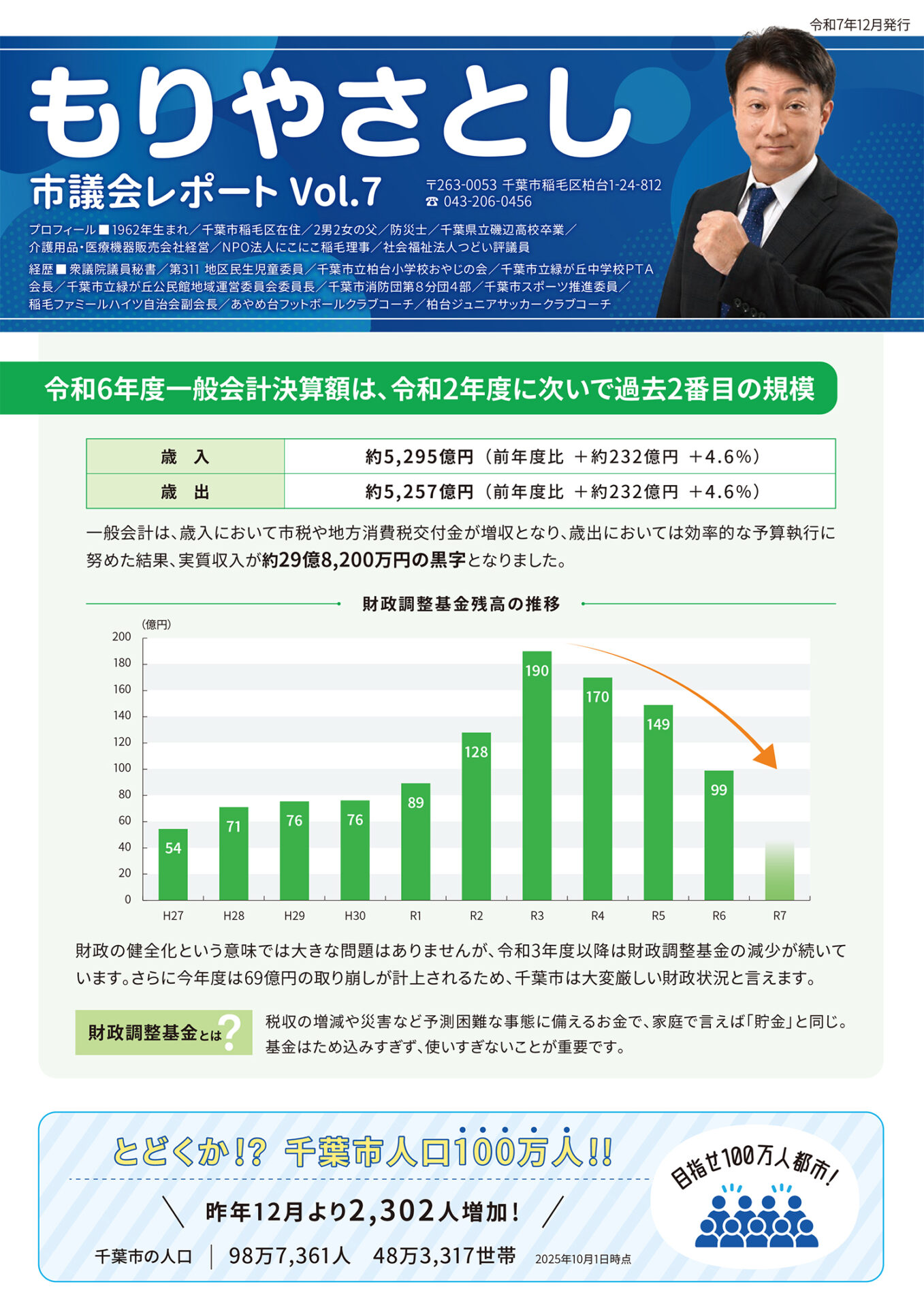 活動予定 活動履歴 地域課題の解決 市政報告 役立情報 千葉市議会レポート 2025年第7号(令和7年12月発行)をアップしました。是非ご一読いただき、ご意見・ご要望・ご感想をいただければと存じます。 PDFはこちら 市政報告 リーフ 【動画】令和7年第3回定例会(本会議 市政に関する一般質問)│令和7年9月30日 【動画】令和7年第4回定例会(本会議 一般質問)│令和7年12月11日 関連記事 【動画】令和7年第4回定例会(本会議 一般質問)│令和7年12月11日 2025年12月19日 【動画】令和7年第3回定例会(本会議 市政に関する一般質問)│令和7年9月30日 2025年10月11日 【リーフ】千葉市議会レポート Vol.6(令和7年8月発行) 2025年7月24日 【動画】令和7年第2回定例会(本会議 市政に関する一般質問)│令和7年6月20日 2025年7月23日 【リーフ】日本維新の会ちば 会派レポート第2号 2025年4月18日 【動画】令和7年第1回定例会(予算審査特別委員会)│令和7年2月25日 2025年3月3日 神谷市長と政策協定締結 2025年3月3日 【リーフ】千葉市議会レポート 2025年新春号(令和7年1月発行) 2025年1月6日