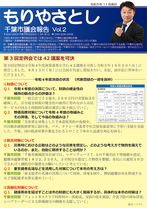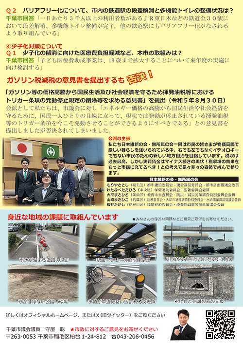 活動予定 活動履歴 地域課題の解決 市政報告 役立情報 千葉市議会報告 Vol. 2(令和5年11月発行)をアップしました。是非ご一読いただき、ご意見・ご要望・ご感想をいただければと存じます。 市政報告 リーフ 【動画】令和5年第3回定例会(本会議 代表質疑)│令和5年9月15日 午前10時 【動画】令和5年第4回定例会(本会議 一般質問)│令和5年12月12日 関連記事 【動画】令和7年第4回定例会(本会議 一般質問)│令和7年12月11日 2025年12月19日 【リーフ】千葉市議会レポート Vol.7(令和7年12月発行) 2025年11月4日 【動画】令和7年第3回定例会(本会議 市政に関する一般質問)│令和7年9月30日 2025年10月11日 【リーフ】千葉市議会レポート Vol.6(令和7年8月発行) 2025年7月24日 【動画】令和7年第2回定例会(本会議 市政に関する一般質問)│令和7年6月20日 2025年7月23日 【リーフ】日本維新の会ちば 会派レポート第2号 2025年4月18日 【動画】令和7年第1回定例会(予算審査特別委員会)│令和7年2月25日 2025年3月3日 神谷市長と政策協定締結 2025年3月3日